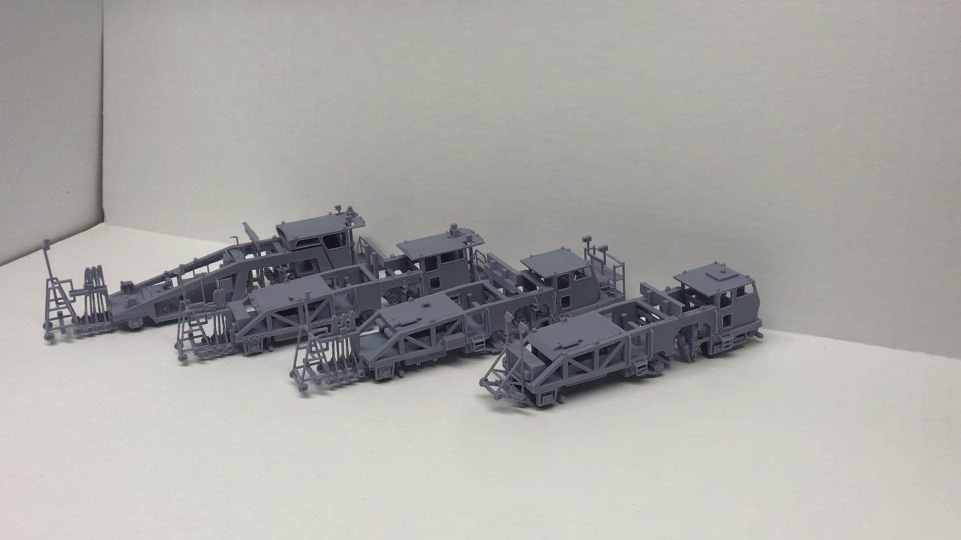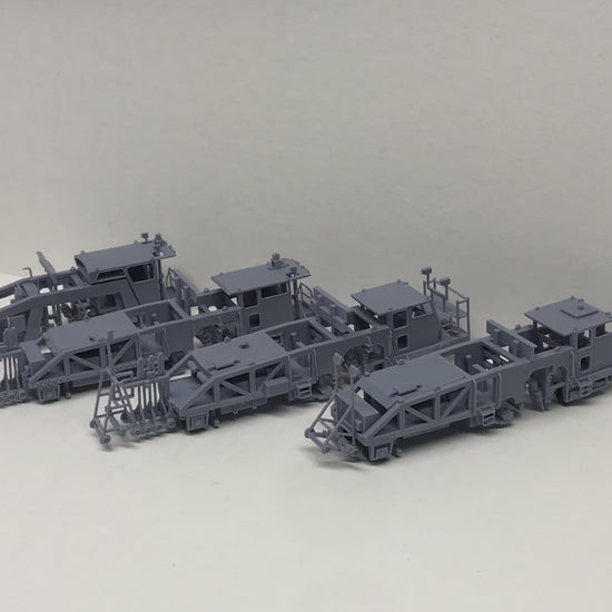 Kit includes main frame, cab, engine hood, steps and laser buggy. Builds one tamper. 3D printed 28" wheels included, or use standard 33" freight car wheel sets.